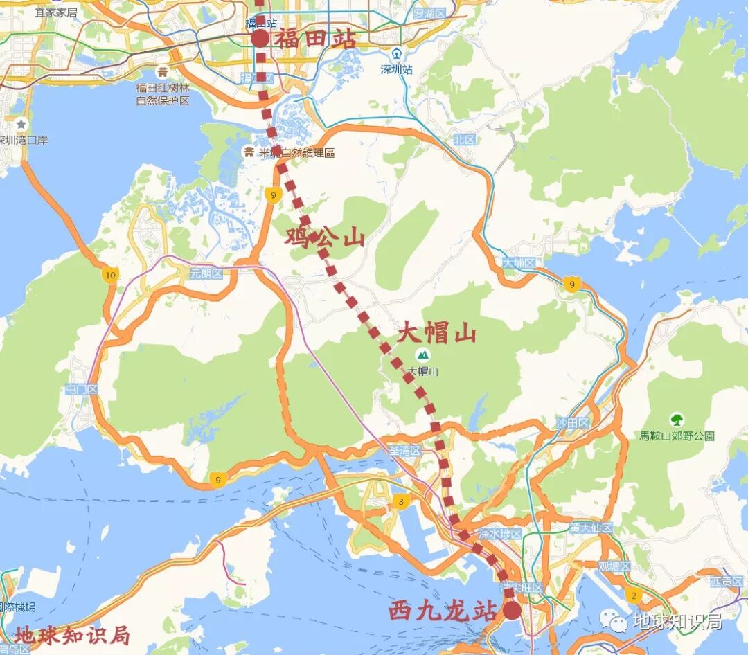 广深港高铁香港段全程也均在地下建设。受此工程限制,这一区段设计时速为200公里/小时。线路由深圳的福田站引出后,向南由皇岗下穿深圳河进入新界,隧道线路直穿过米埔、鸡公岭、大帽山及金山等新界中部地区,途径九龙城区的深旺道、大角咀区、海泓道和连翔道后,引入西九龙站。