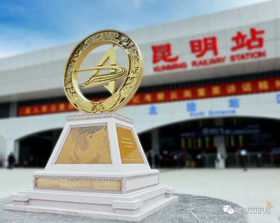 北广场的中老铁路零公里标雕塑,揭幕前、揭幕后