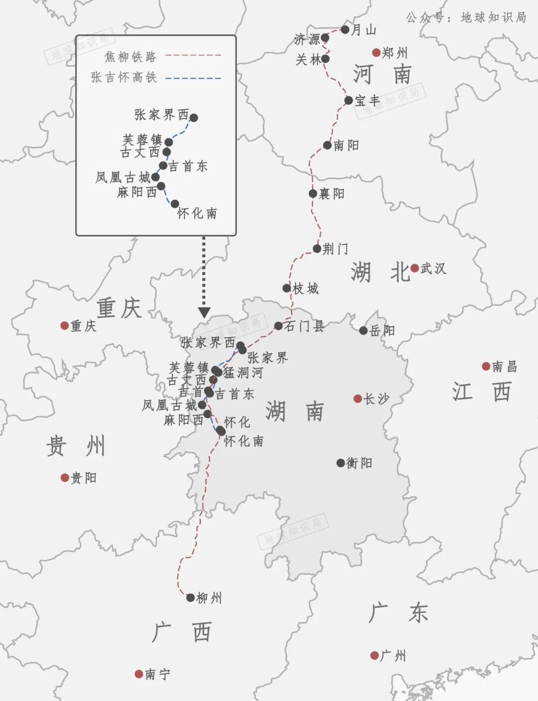 该线路全部位于湖南省境内西部,辐射湘西主要地市,有着“湘西最美高铁”之称,地跨3个市州8个县市区,北起张家界西站,南至怀化南站:途经张家界市永定区,湘西土家族苗族自治州永顺县、古丈县、吉首市、凤凰县,怀化市麻阳苗族自治县、鹤城区、芷江侗族自治县。