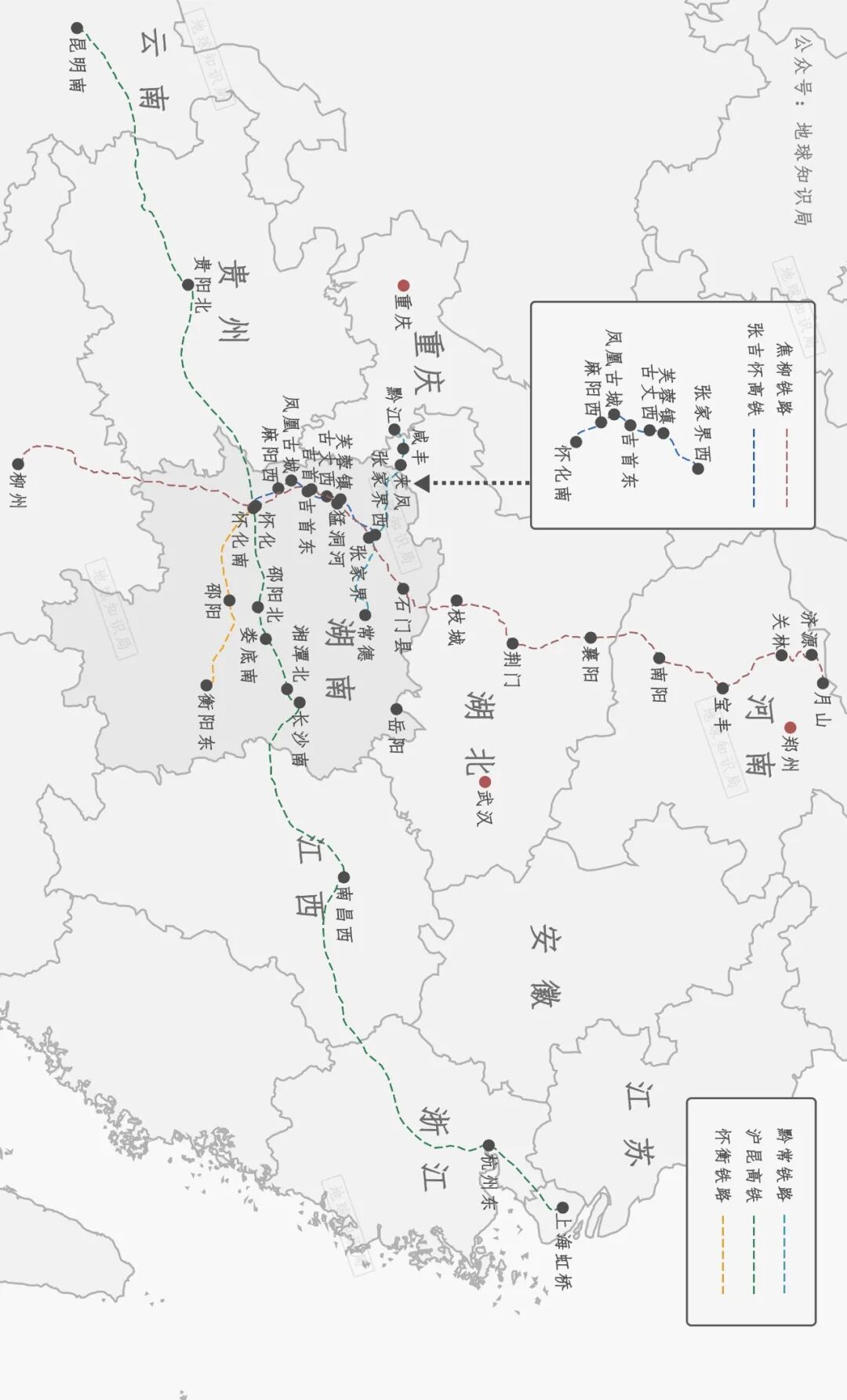 张吉怀高铁,以其设计350公里的时速,成为“八纵八横”高速铁路网沪昆高铁和渝长厦高铁之间的区域“黄金联络线”,北接黔(张)常铁路,南连沪昆高铁、怀(邵)衡铁路,连接湖南省西部主要市州,辐射整个武陵山区。
