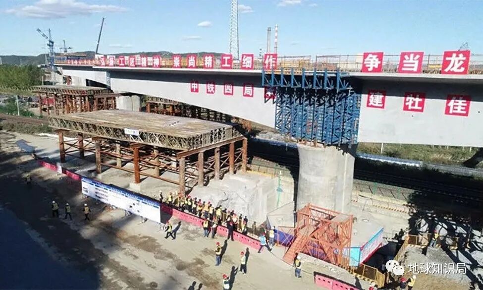 牡丹江特大桥是全线最大跨度转体连续梁,跨图佳铁路呈26°夹角,全长6093米,共有5跨连续梁结构。