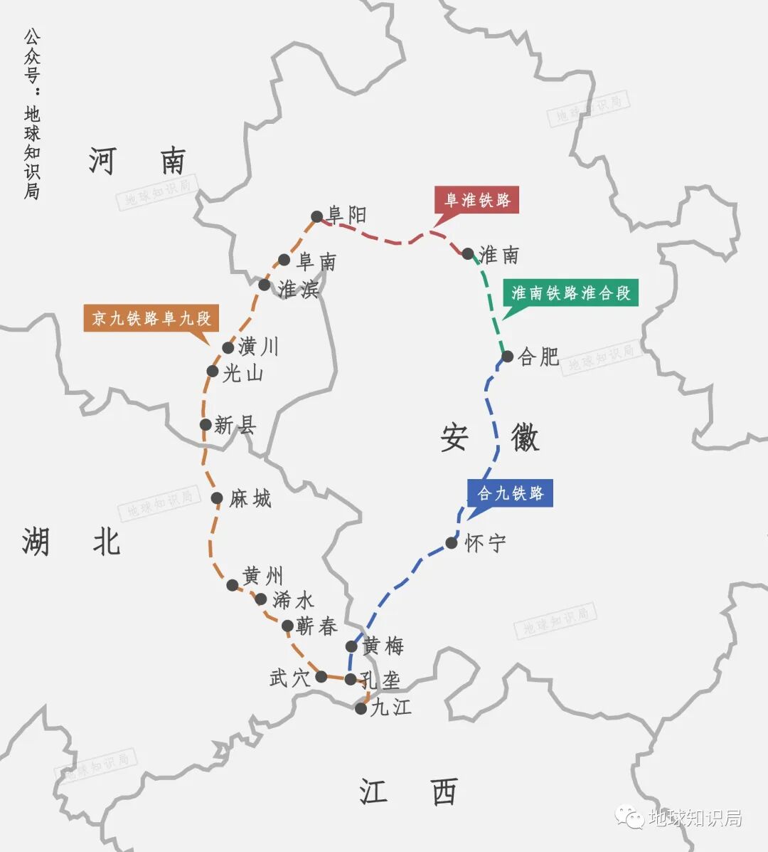 京港高铁与京九铁路的阜九段差异较大,京港高铁的路径选择了途经合肥的阜淮铁路+淮南铁路+合九铁路的走向线路,未使用既有普铁路径。