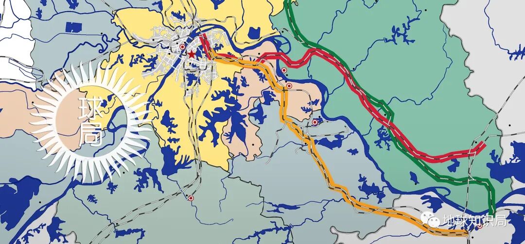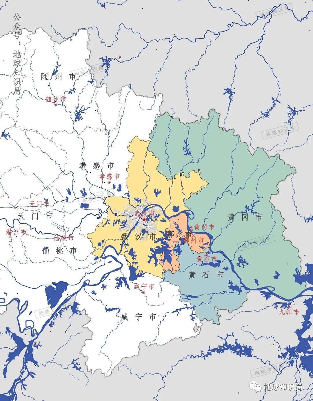 湖北省东南部地区,尤其是从武汉到黄梅一线的长江两岸,均有县级以上行政单位的中心城区分布。