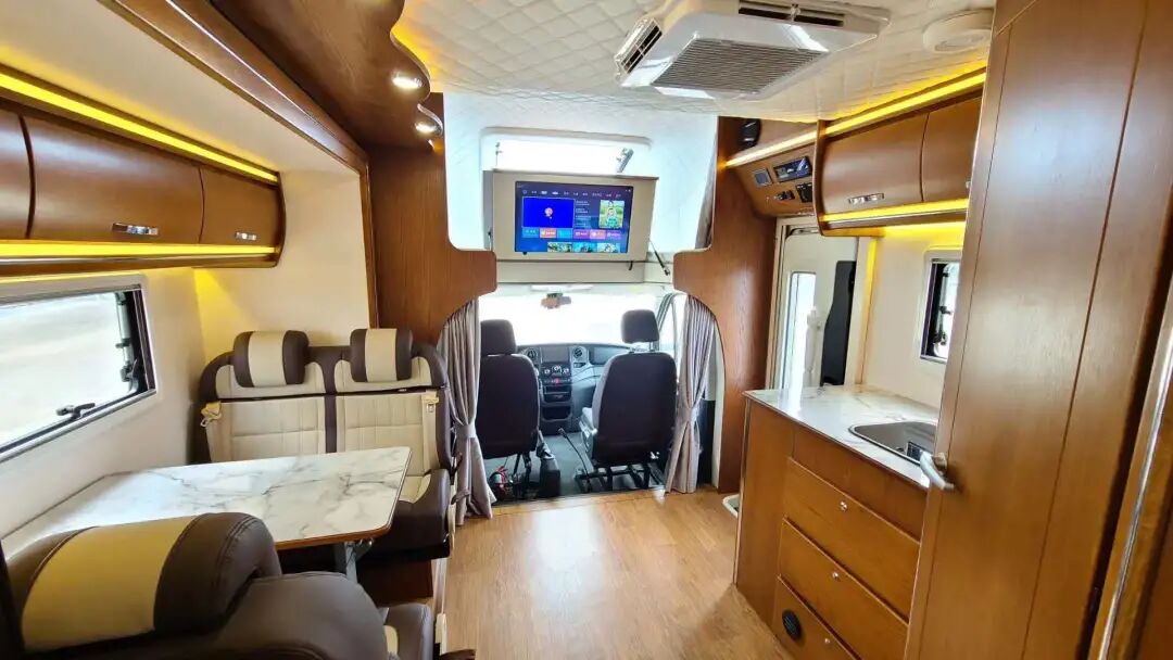 车身采用前上门设计,进入车内右侧便是驾驶室,空间宽敞、视野开阔。配置主副驾座椅、多功能方向盘、副安全气囊、电动加热加宽外后视镜、150A+150A双发电机、ESP、胎压监测、倒车雷达、倒车监测等,配置多,让旅途多一份安心。驾驶室上方便是额头床,可提供休息。将额头床板上翻便是32寸智能电视,搭配先锋四喇叭音响系统,行车中更多了几分乐趣。
