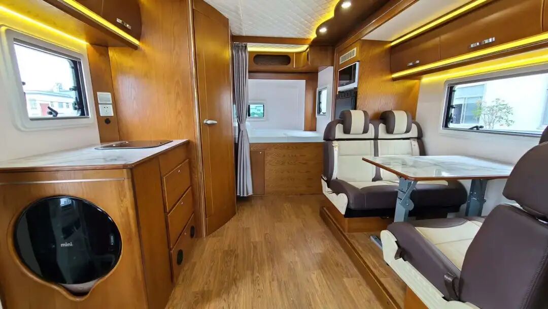 卡座对面便是厨房区域,,配有电磁炉、房车专用抽油烟机、翻盖水槽、折叠水龙头、通风窗户等。上下均有储物柜,储物空间大,收纳也很方便,同时还带有大宇3kg洗衣机,带烘干功能,在旅途中也不用担心阴雨天气了。