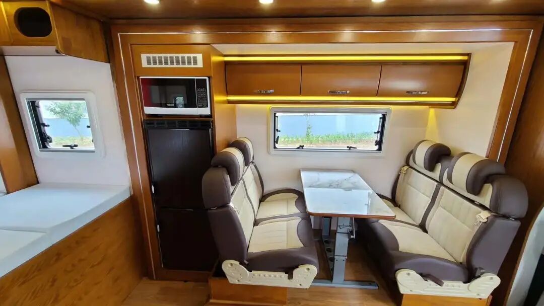 车身中部便是会客区,采用进口环保型专用地板革,实木家具风格。配有对座式高档卡座,可坐四人,中间搭配房车专用升降餐桌,驻车休息后,可与卡座拼成一张临时休息床铺。卡座上方配有储物吊柜,可储物收纳。卡座后方是148L车载专用冰箱和微波炉,设计很贴心。
