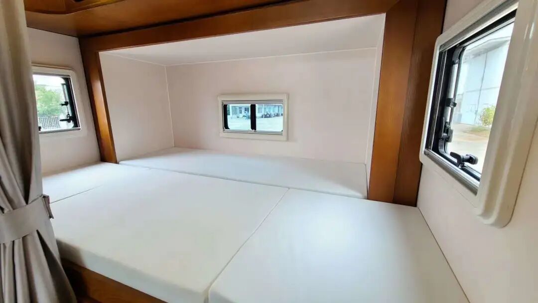 房车尾部配有拓展双人床,尺寸为2230*1360mm,左右包括后面均有通风窗户,空气流通不压抑。床头还设有床头灯,方便阅读。