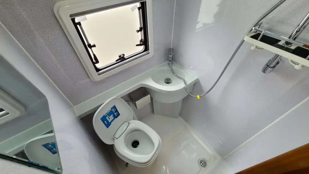 卫生间紧靠厨房区域,经过防水处理,内置独立淋浴花洒、抽拉式马桶、面盆、水龙头、梳妆镜、通风窗户等,满足基本的洗浴需求。