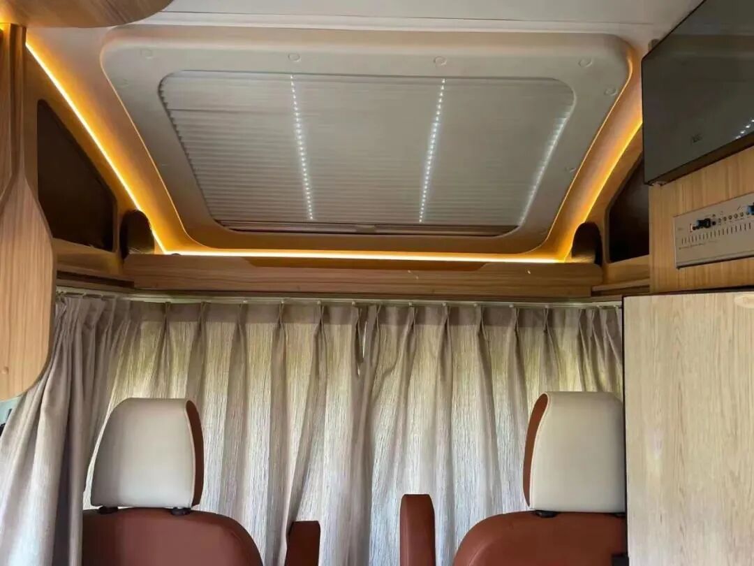 车内额头处并未设计休息区,取而代之的是一个尺寸较大的天窗,加强内部采光、通风,同时带有防蚊纱网、隔断帘方便日常使用;天窗下方设有抽拉板,拉开后便是超大储物空间,可用于放置被褥、衣物;