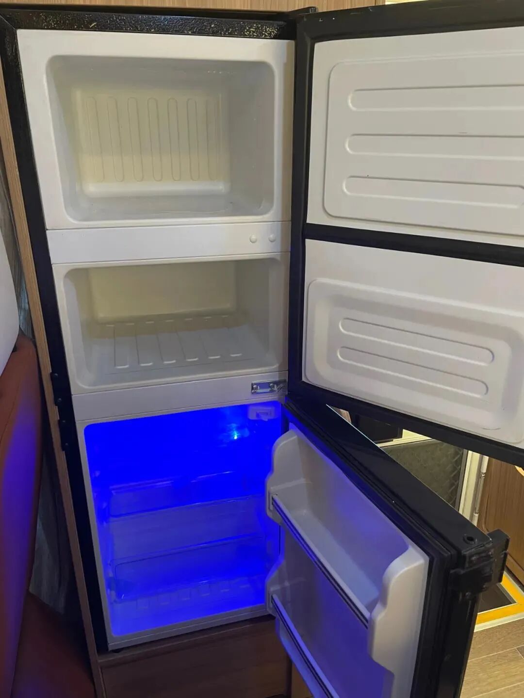 液晶电视侧方装有133L车载冰箱,方便长途旅行时储存大量食材;冰箱上方为格兰仕微波炉烤箱和专业级功放系统(可取消);