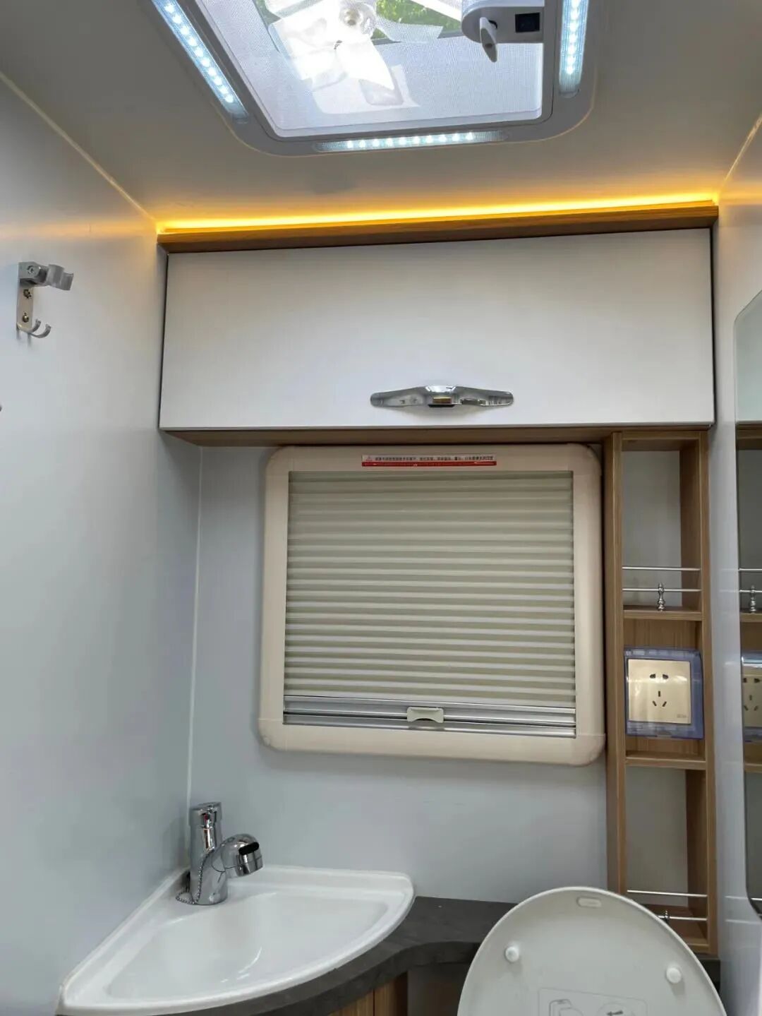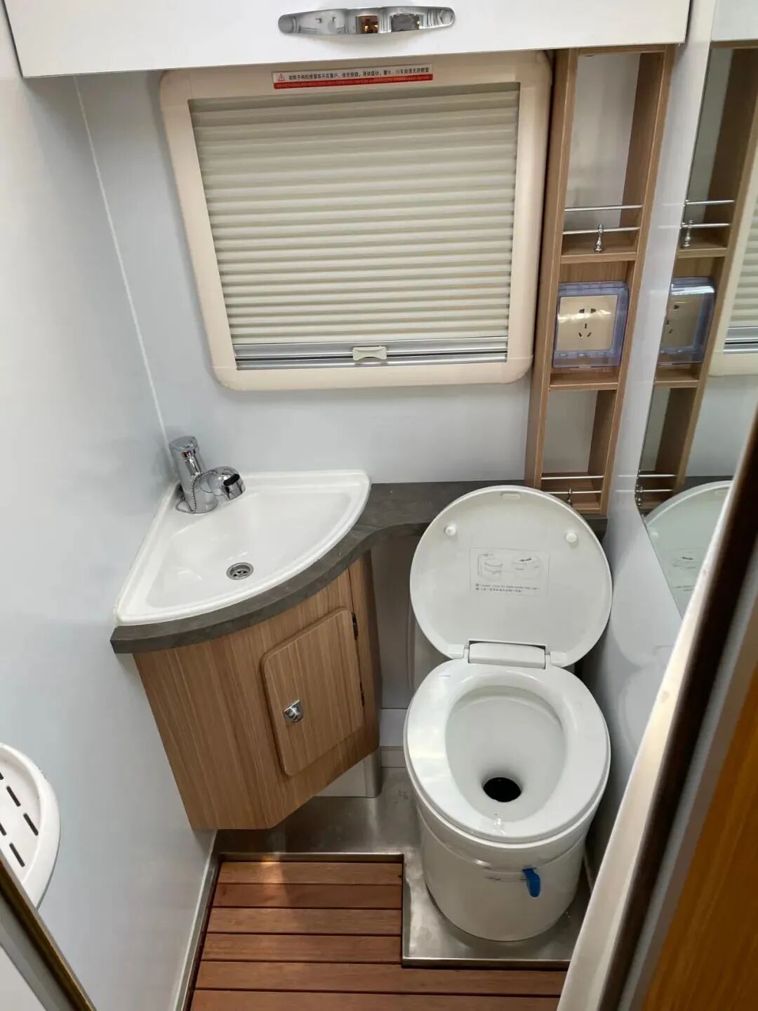 一体式防水卫浴间位于车内中部,内部配置了环保旋转马桶、洗漱池、淋浴花洒、浴镜防水插座、储物柜、置物架等卫浴设施;底部铺设格栅式沥水板,有效防止积水残留的同时也具备防滑的效果;