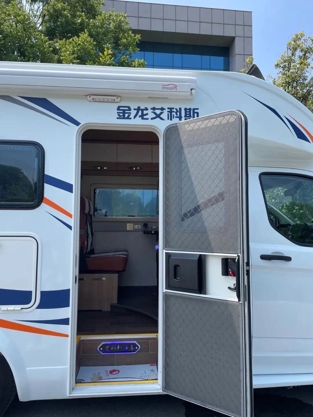 进入生活舱的方式有两种,一是从驾驶舱的贯通式过道进入,另一种便是通过房车专用乘客门了;乘客专用主门选用美式房车舱门,并配备了开合式防蚊纱门,有效避免蚊虫侵袭,旅居生活更安逸;