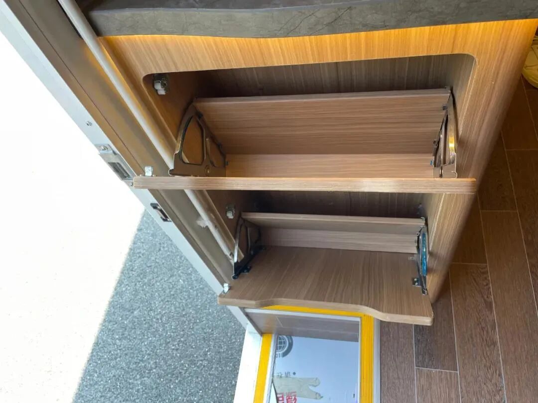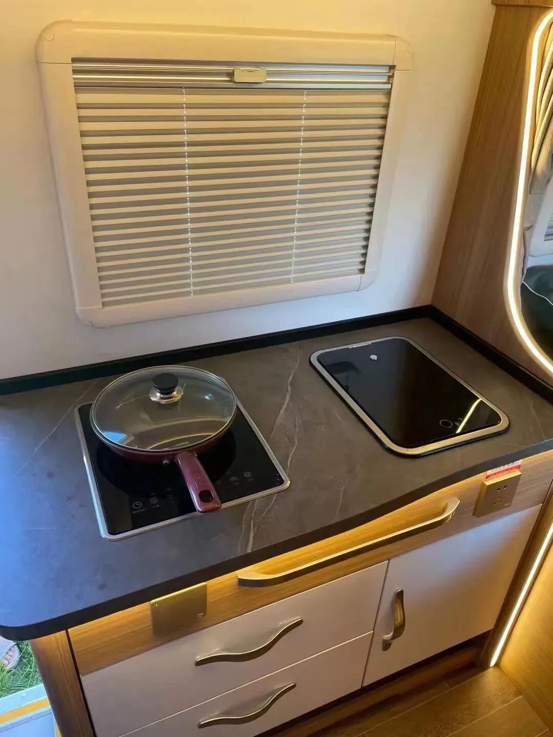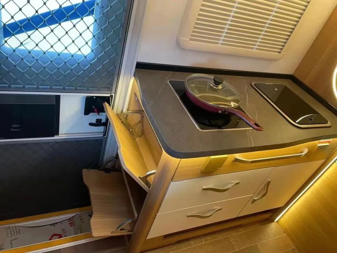 鞋柜另一侧便是车内的厨房区了;厨房区配备了超大的操作台面,内部装载家用式220V电磁炉、盖板式洗菜池、外推窗、电源插座、储物抽屉、储物柜等丰富齐全的设施,让你在阴雨天亦可享受做饭的乐趣;