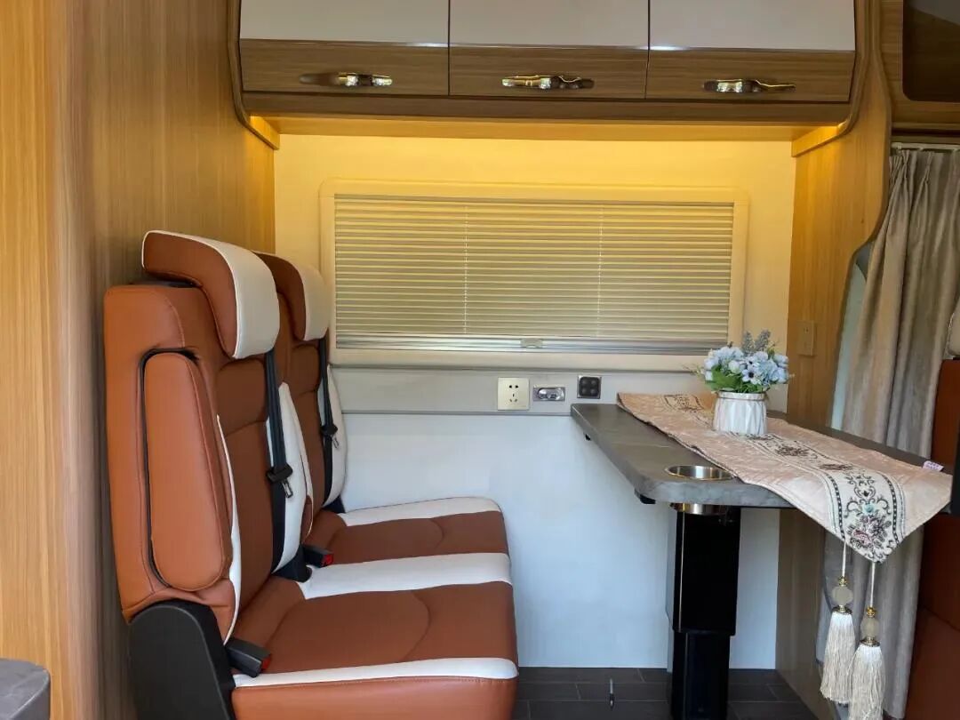 会客区位于生活舱左前方,内设房车专用3C双人座椅(颜色可选,另可选装航空座椅/L型卡座),侧方配有扶手,乘坐舒适度大幅提升,同时配备了安全带便于行车时载人;座椅前方是带有杯托的气动升降桌;侧方墙面设有220V插座+12V接口+5V USB充电口方便日常给手机、平板等电子产品充电;插座上方是大尺寸外推窗(带隔断帘、纱窗);顶部搭载多组储物吊柜,储存空间丰富;