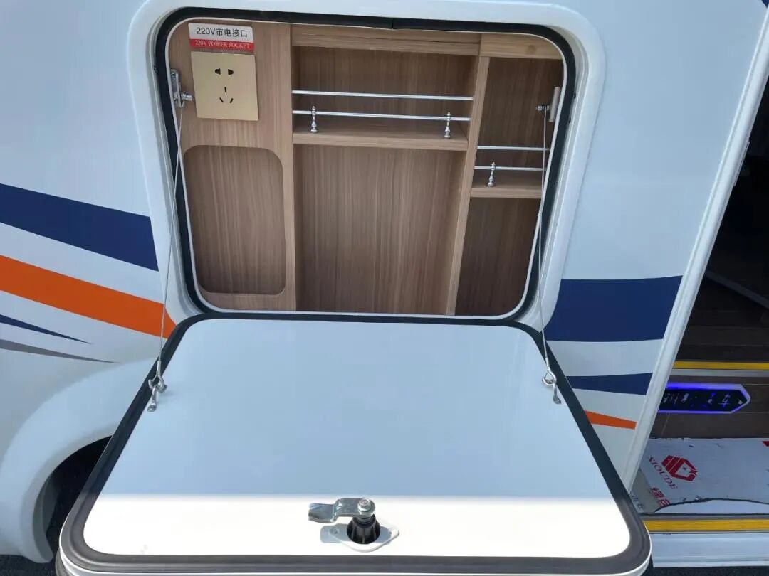 车身外部配备了遮阳棚、外置储物舱(可选贯通式储物舱)、房车专用乘客门、户外照明灯、水电集成盒、重力注水口、市电接口、黑水箱等设施,满足户外不同场景下的使用需求;