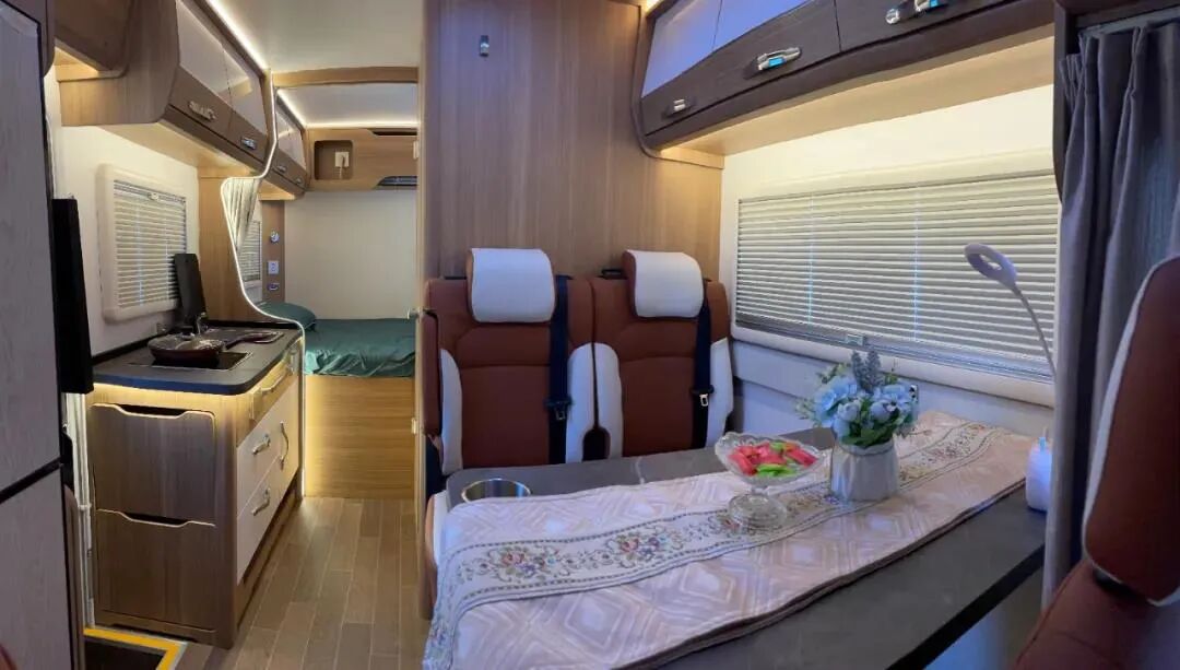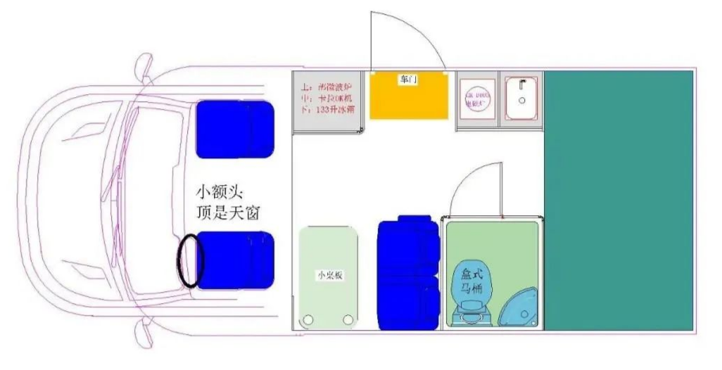 车内布局如下图,从左至右依次为驾驶区、会客区、厨房区、卫浴区以及尾部的休息区;