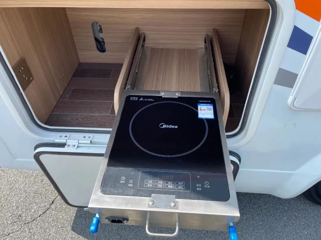 车外右侧尾部设有户外厨房,内置抽拉式220V电磁炉(可选柴油炉明火/无明火,燃气灶+10KG液化气的搭配),侧方留有储物空间方便放置厨房用品;