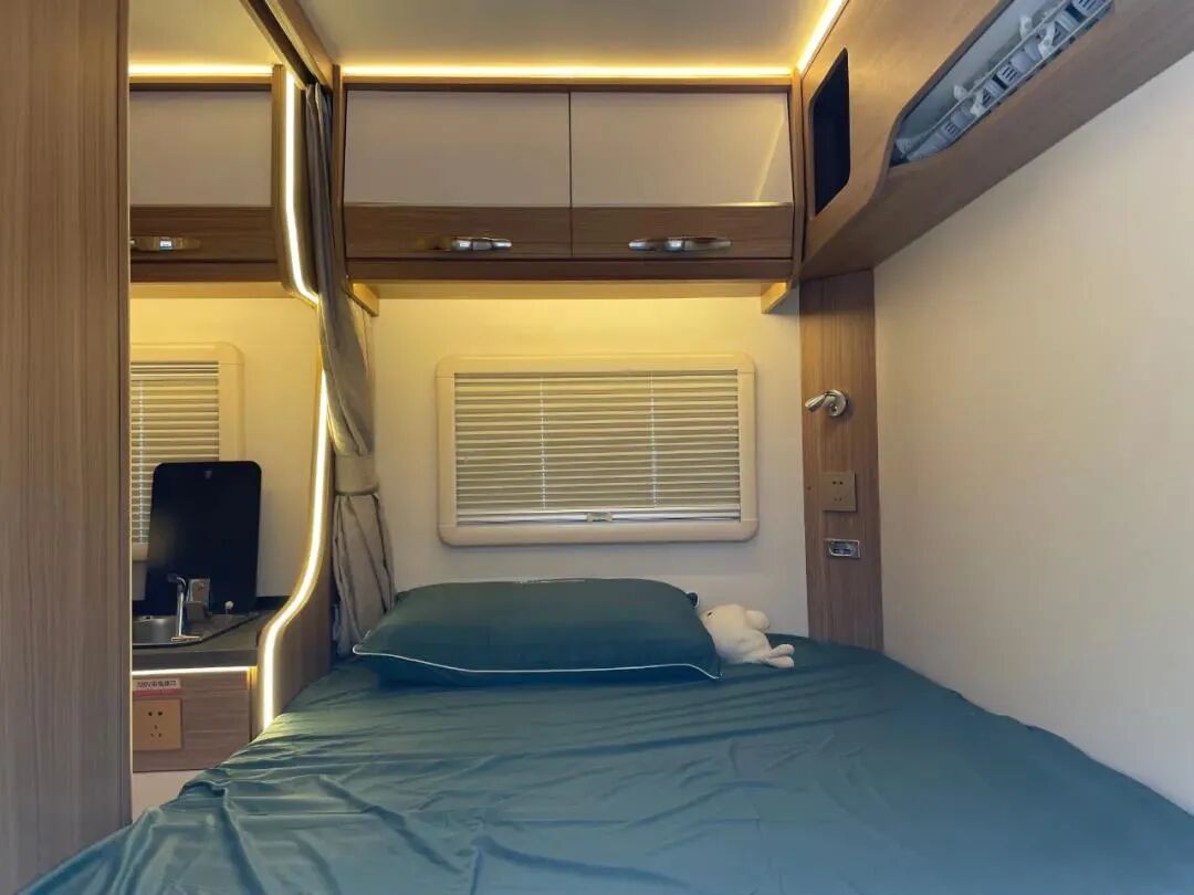 固定休息区在车尾处,该部分横向放置了一张双人床,内部空间充足,可满足多人睡眠的需求;双人床两侧分别设有外推窗(带隔断帘、纱窗),进一步加强内部采光、通风的效果,也方便驻车时观赏窗外风景;顶部搭载储物吊柜、格力家用大1P空调(静音节能,节能环保,制冷效果好);墙面拐角处设有电源插座、阅读灯方便车上人员夜间休息时使用;