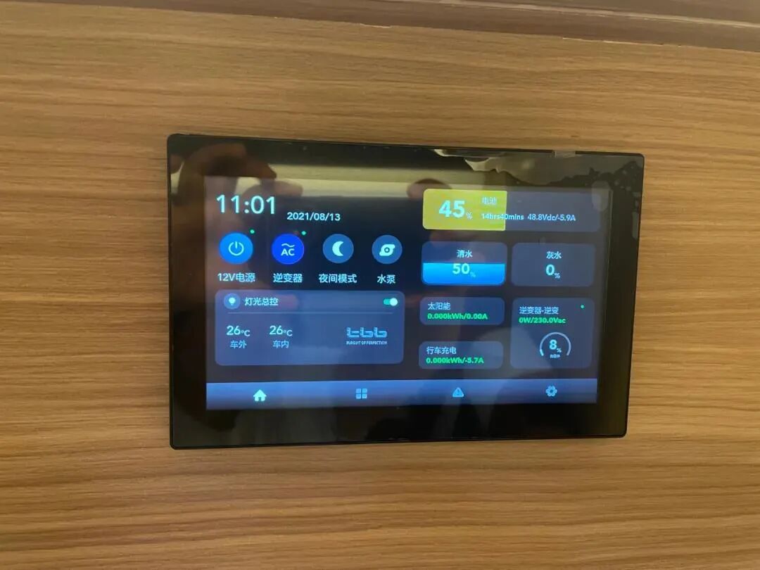 水电方面,整车配备了150L清水箱、50L灰水箱、48V 200AH锂电池(约等于9.6度电)、3000W充逆变一体机、600W太阳能等,可升级/减配;与之搭配使用的还有家用50L热水器、房车专用水泵、7寸触摸式控制系统等;