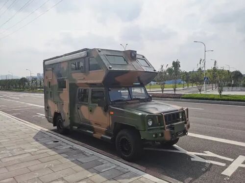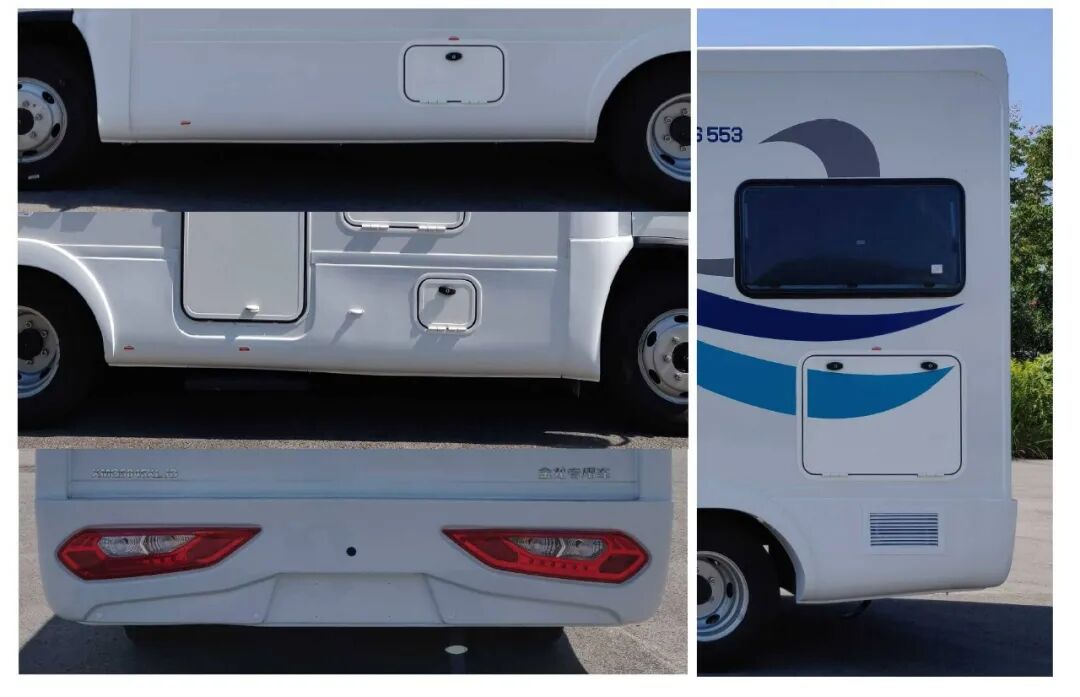 该车侧、后防护由车体结构代替,侧防护下边缘离地高度475mm,后防护下边缘离地高度480mm;该车配备冰箱、厨具、卧具、卫生设施等设备,用于旅行宿营;选装取消顶置空调时整车高度为3200mm;单侧选装遮阳棚对应车身宽度为2380mm;车身两侧可选装不同型式侧窗、侧舱门、注水口和注电口的样式及位置,选装侧通风格栅。