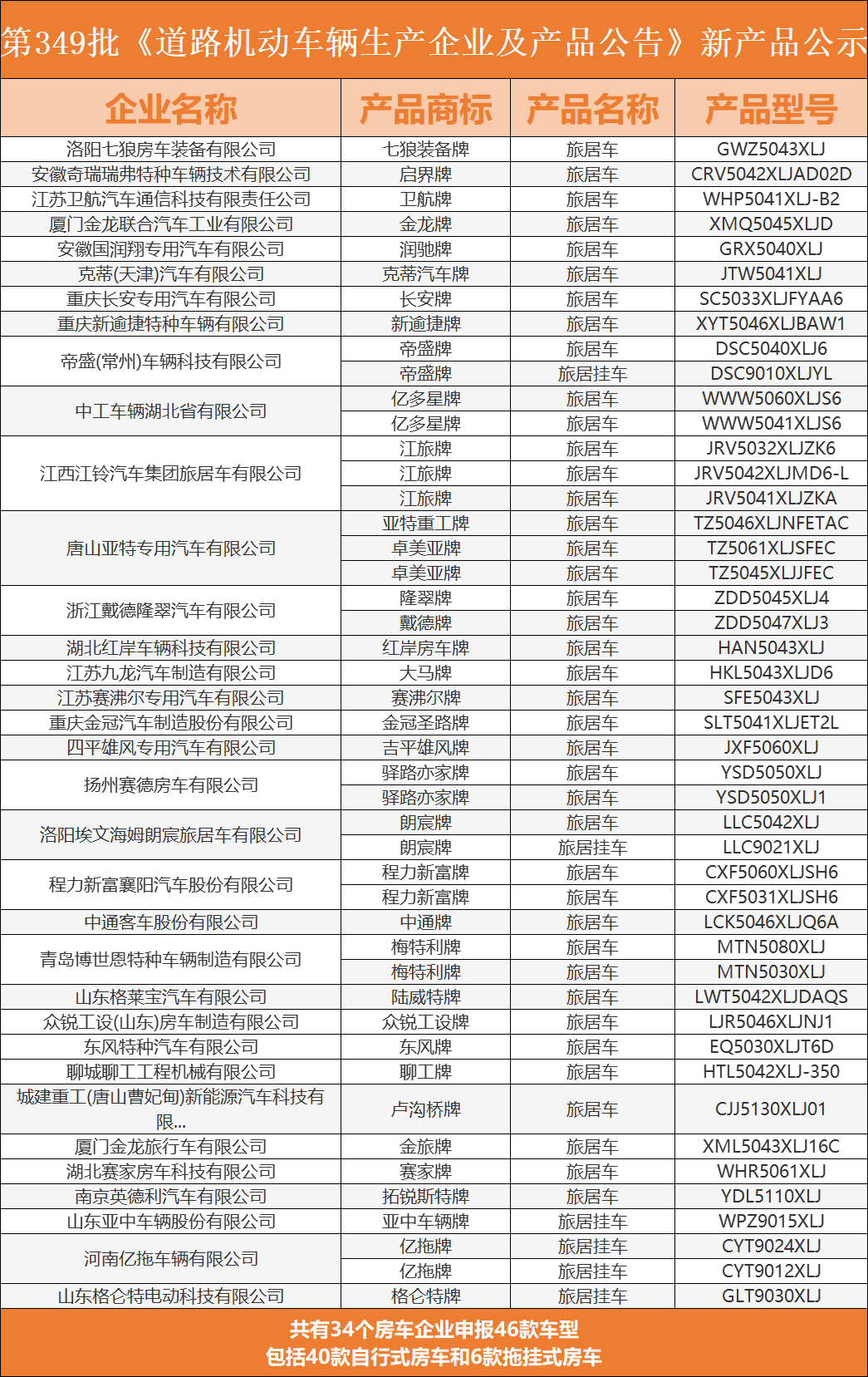 2021年10月12日,国家工业和信息化部在官方网站公示了349批关于《道路机动车辆生产企业及产品公告》(以下简称《公告》)新产品,其中共有34家房车企业申报46款车型,包括40款自行式房车和6款拖挂式房车。