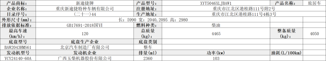 1.主要专用装置:车身厢体,睡具,厨具,洗手台,蹲便器等2.选装遮阳帘是整车宽2095,3.发动机YCY24140-60A最大净功率为99KW,油耗申报值为10.6L/100km,4.侧防护均由不锈钢钢板制成,材料为R304,采用螺栓连接形式与车身副梁连接。