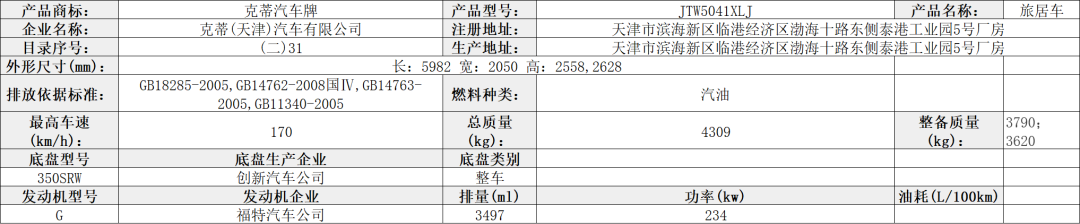 该车车厢内配备环形沙发、升降床、厨具、洗菜池、马桶、淋浴、空调等生活设施;车顶无选装时高度3590mm,选装天窗时高度3690mm;两侧无选装时整车宽度2410mm,装遮阳棚时宽度为2520mm,整备质量10864kg;专用功能:该车具有旅居生活设施和娱乐设施,可用于旅行宿营 。