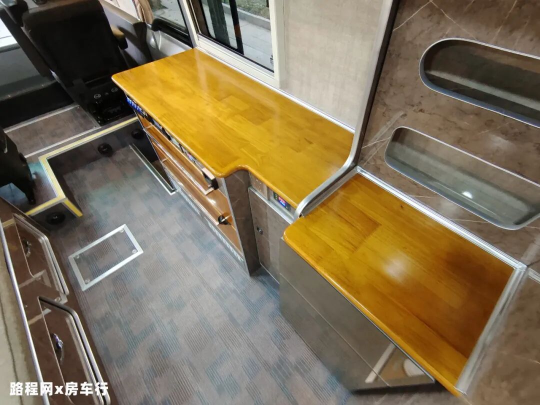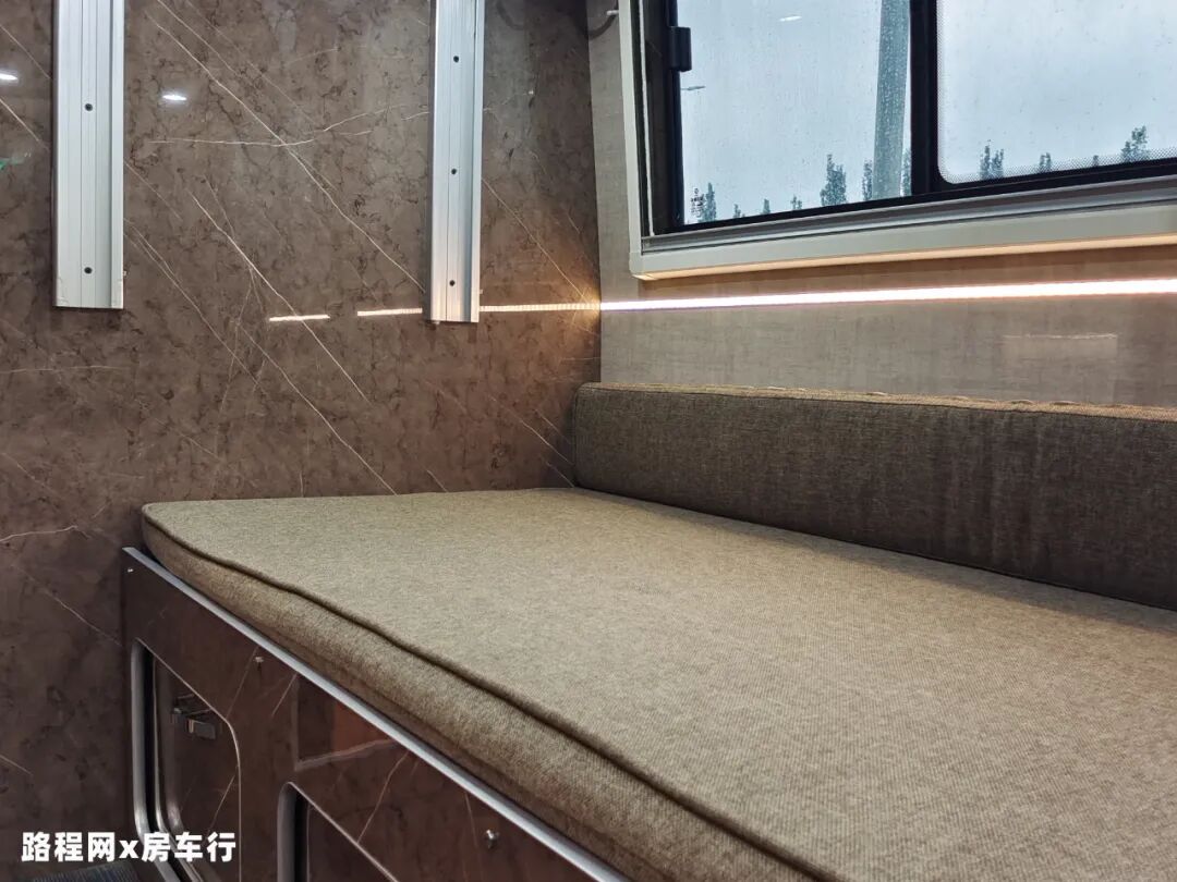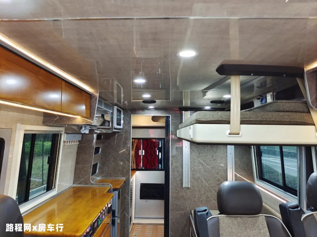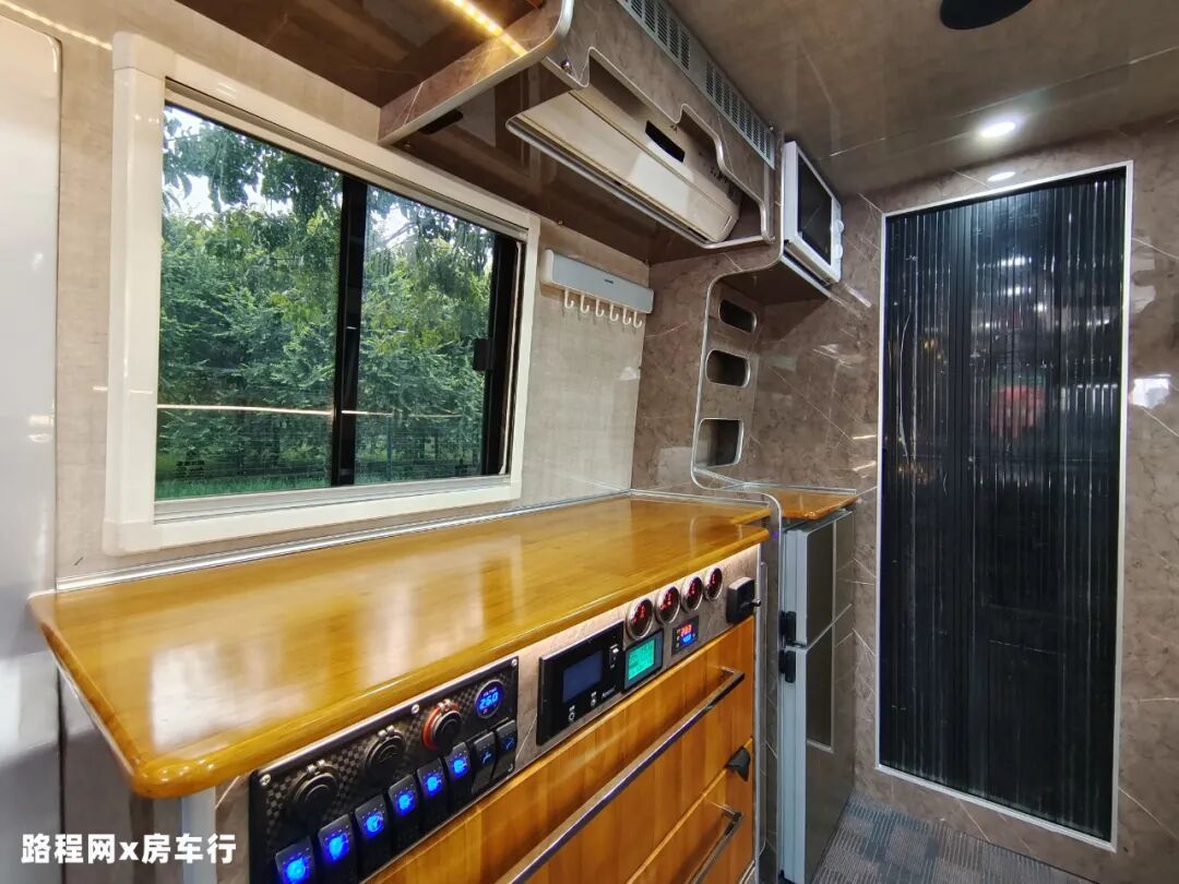 为减少车内做饭油烟泛滥的问题,这款车把厨房区分为两个部分,一体式橱柜位于外部,超大的操作台面满足你大展身手的需求,做饭时也不用因面积不够而畏手畏脚;烹饪区则在尾部,与生活舱分隔开来;