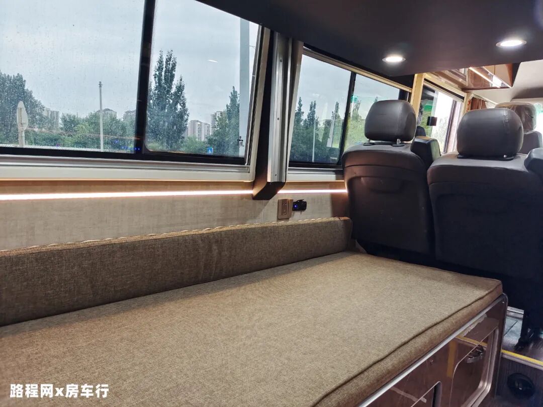 会客区位于车厢中部,采用2+1的布局,座椅带有安全带方便行车时载人,同时还有扶手、头枕增加乘坐舒适度,长途旅行时,久坐不易疲劳,旅行更舒心;双人座椅位于左侧,前方设有餐桌可供日常休闲娱乐使用;侧方有电源插座可供手机充电;