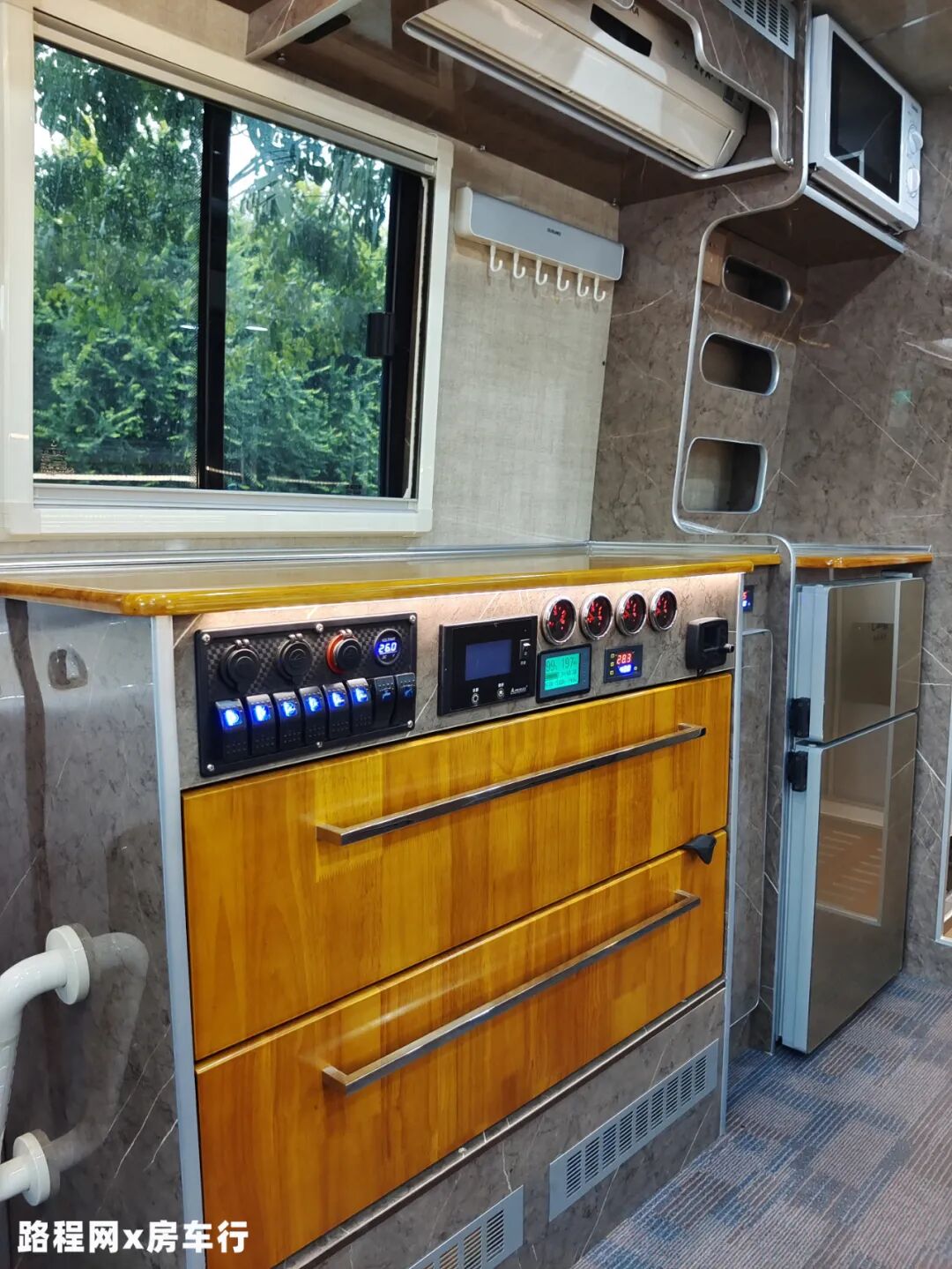 操作台下方是车内水电监测、控制区域;一体式橱柜下方设有储物抽屉,顶部搭载格力1.5P家用空调、挂钩、微波炉、储物吊柜等设施;