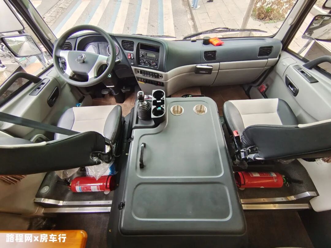 最前方的驾驶舱视野状况良好,原车内饰并未进行太多变动,主副座椅可旋转司机气囊悬浮座椅,中间区域可用于放置物品,前方还有两个杯托;行车方面配置了多功能方向盘、定速巡航、北斗卫星定位、记录仪带打印、OBD座、重型车远程排放终端T-BOX、24V行车空调等辅助驾驶;