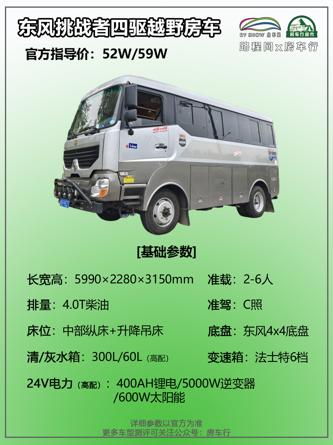 东风挑战者四驱越野房车的车身外尺寸为5990x2280x3150(加高顶)mm,车厢内高1850mm,轴距3300mm,核载2-6人,蓝牌C照可驾驶;整车整备质量为5560kg,允许最大总质量可达7300kg;