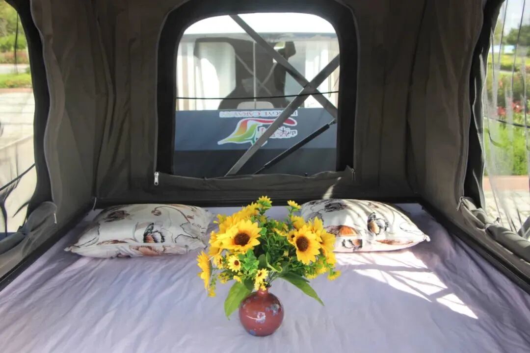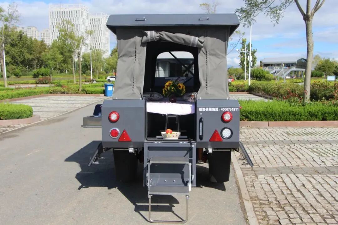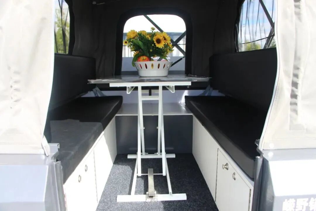 顶部设有升顶式帐篷,升起后形成一个舒适、宽敞的空间;房车内部两侧分别设有可供双人乘坐的卡座,中心位置设有可升降餐桌,可供日常就餐使用。