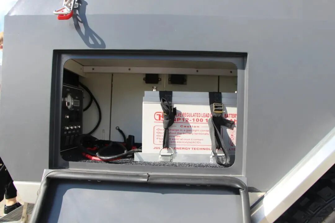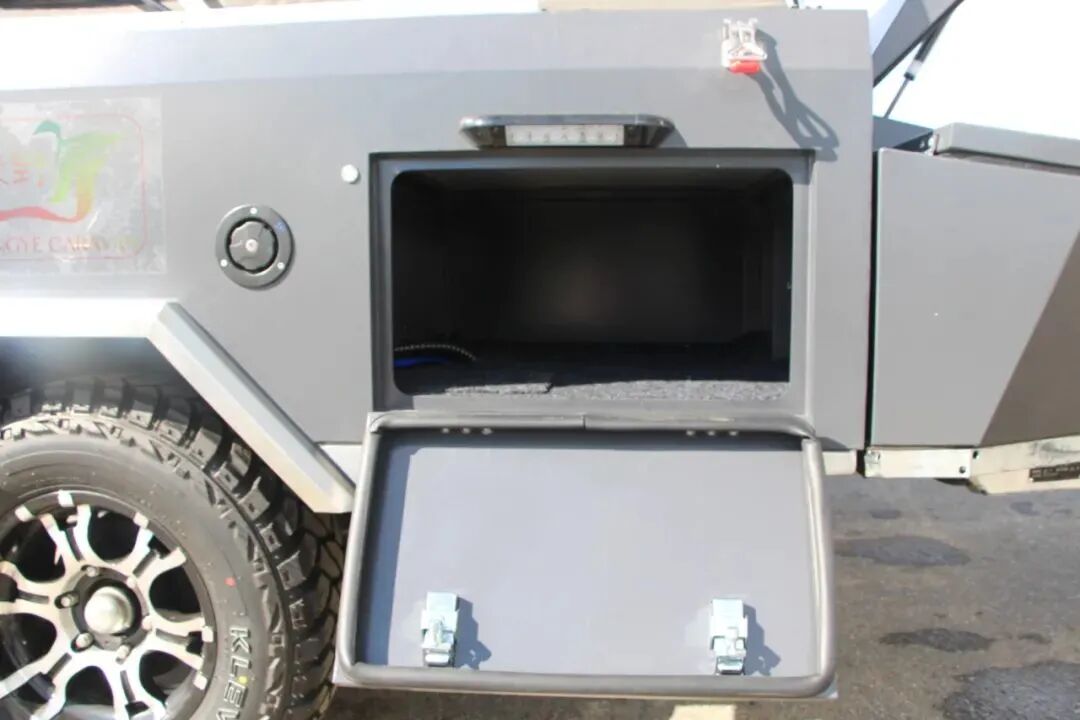 车身整体采用灰色色调,彰显野性霸气的气质;轮胎选用越野专用轮胎,能够应对多种复杂地形,车底还配有全尺寸备胎,可防止野外出行时房车轮胎损坏而抛锚。