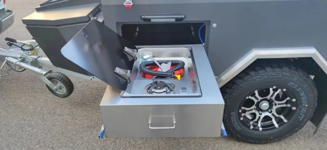 “小二”车身左侧加装有一套专业户外抽屉式厨房,配有单头炉和水盆,可满足日常做饭需求;车辆后侧配有便携式马桶,使用简单、方便,能够解决户外出行的卫生问题。