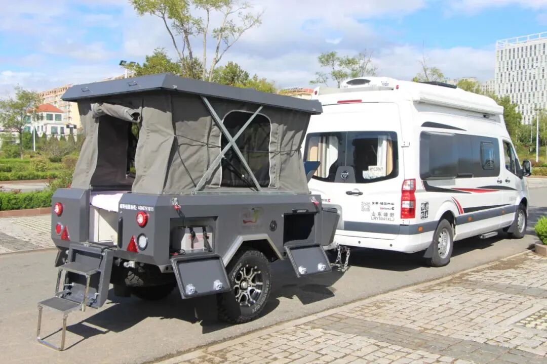 房车车身外尺寸为3700x1700x1420mm,重量880kg,体积小巧;车辆底盘采用独立悬挂式专利设计,具有更高的安全性、稳定性,可实现与牵引车同步越野,同时适用于多种道路场景。