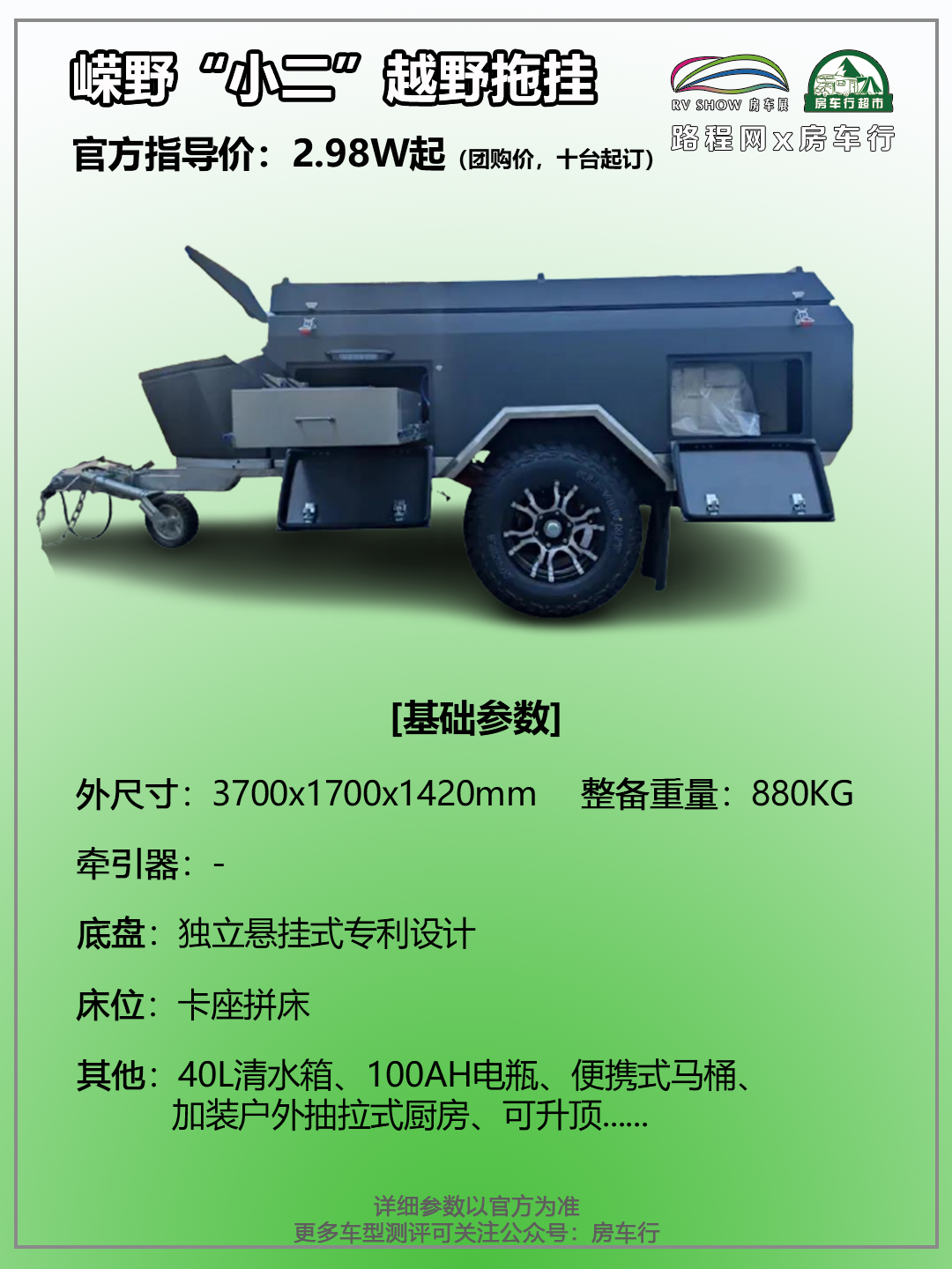 如果你是对房车感兴趣的新手,对户外旅行的生活满怀期待,但又没有太多预算,那么这款紧凑实用、多功能、价格亲民的越野拖挂房车“小二”一定适合你。