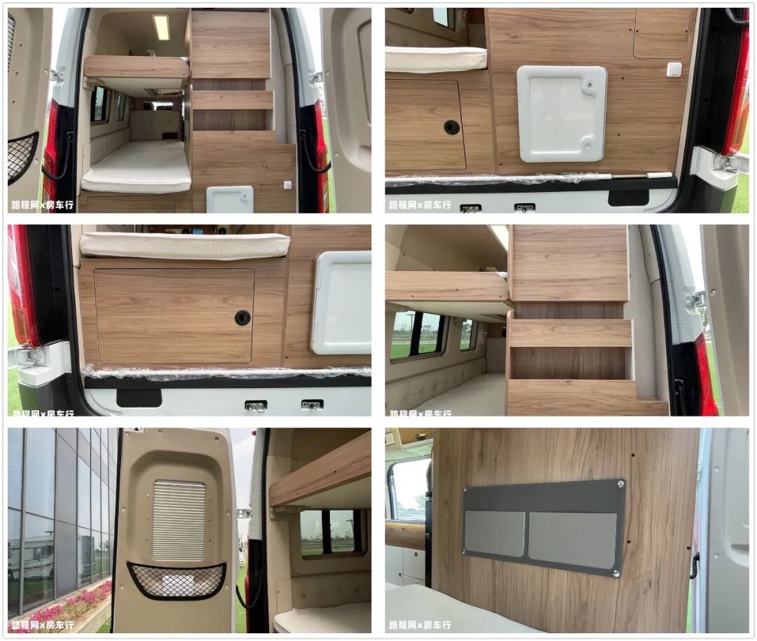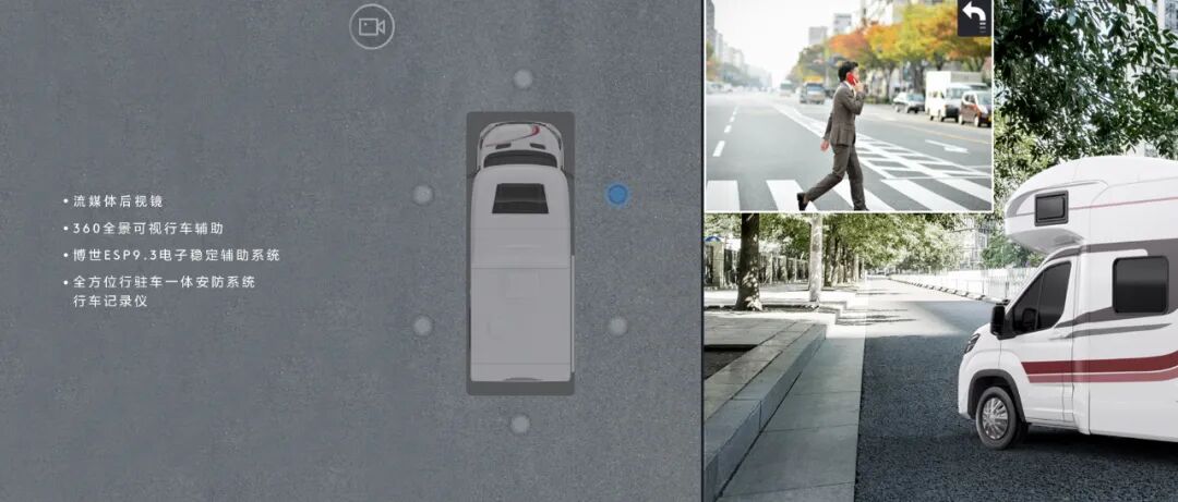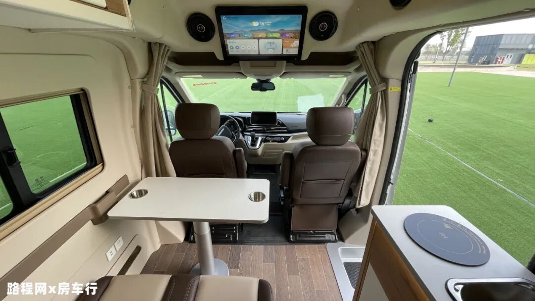 驾驶舱依旧采用原厂房车专有的无钥匙进入及一键启动(带2把智能钥匙,可遥控开关主副驾驶门、房车乘客门);行驻车方面,有Autohold驻车自动保持、EPB电子驻车制动、前雷达+倒车雷达、真皮多功能方向盘、电动助力转向、三模驾驶模式、自动前雨刮、电动电加热外后视镜、发动机电子芯片防盗系统、盲区监测(带下车提醒)+变道辅助、驾驶舱10.25吋高清触控大屏、智能遥控主副驾车窗(雨天自动关窗、远程关闭车窗、夏天模式)、TPMS胎压监测(选装后双胎,只有前轮具备)、主副驾安全气囊等辅助驾驶。