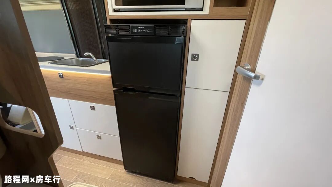 与厨房区紧靠的是一台双开门96L冰箱(横床版为50L),容量够大,满足长途旅行时储存食材所需,日常也可用来冷藏酒水、饮料、水果等;冰箱旁边还有一个小型衣柜;
