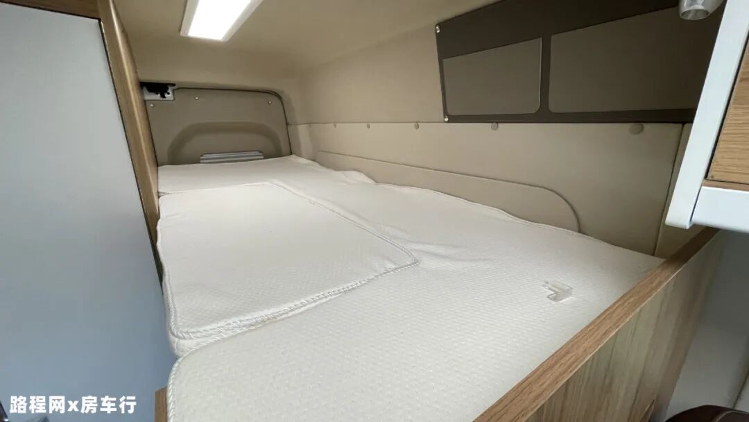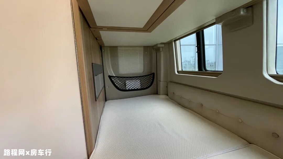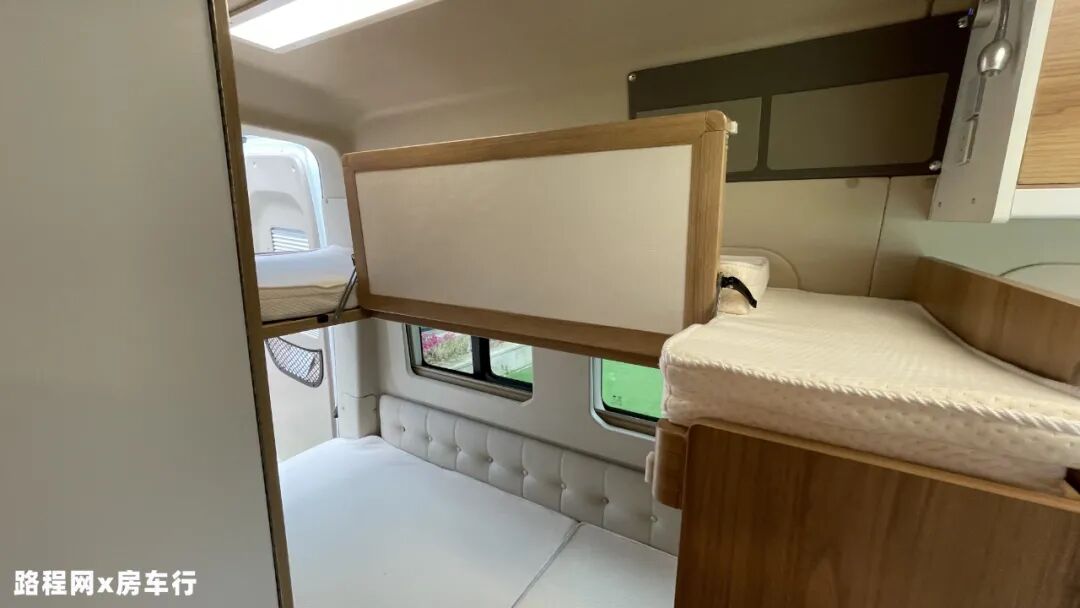 尾部纵置上下铺,空间充足,可满足多人睡眠;上下铺均设有储物袋,可在夜间休息时放置手机、充电器等小件儿物品;