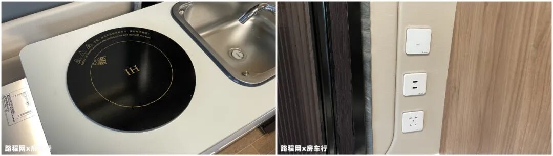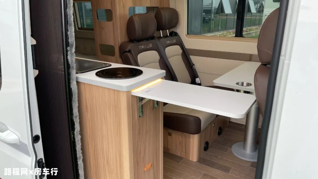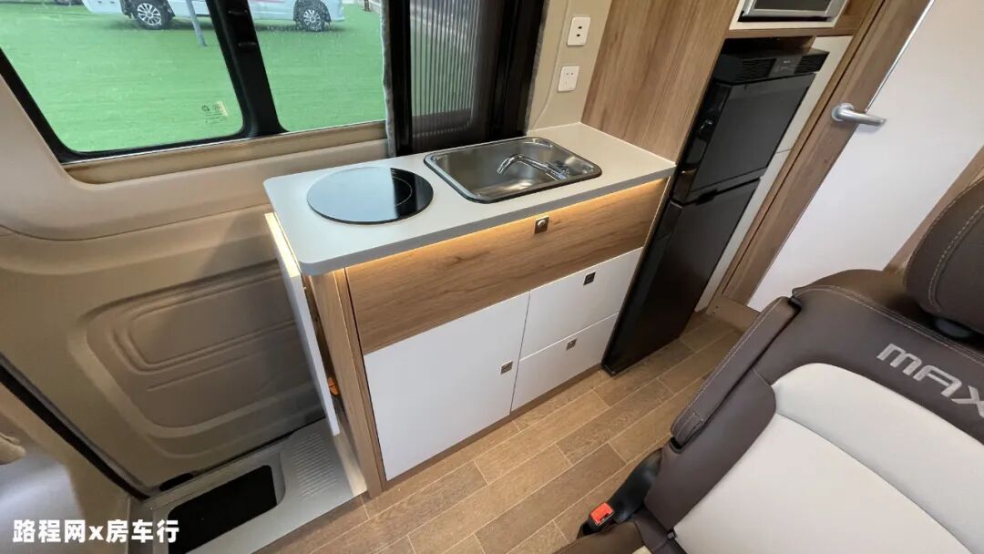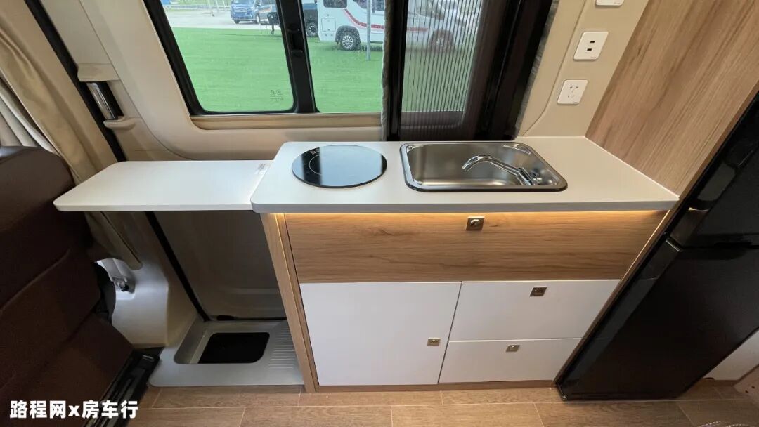 厨房区位于靠近乘客门的位置,采用一体式橱柜的设计,配置了电磁炉、洗菜池、折叠式水龙头、抽屉、储物柜等;