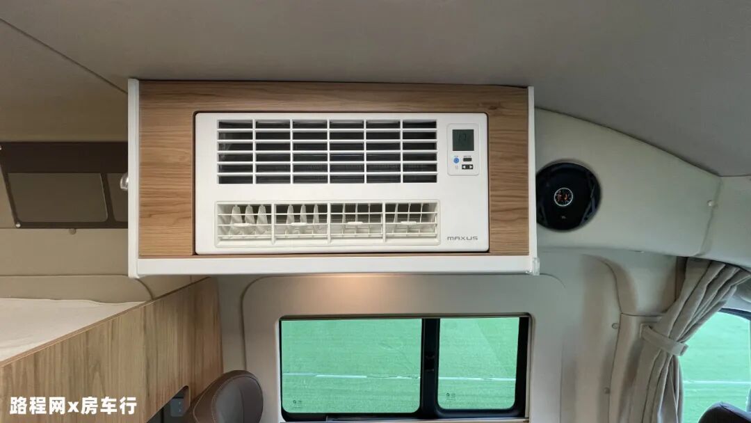 座椅上方为壁挂式原厂房车专用48V直流变频空调(制冷),可搭配驾驶舱的行车空调(10kW,相当于家用空调4匹)使用,另有伟巴斯特驻车燃油加热系统(可支持暖风及热水);制热、制冷均支持APP远程控制;