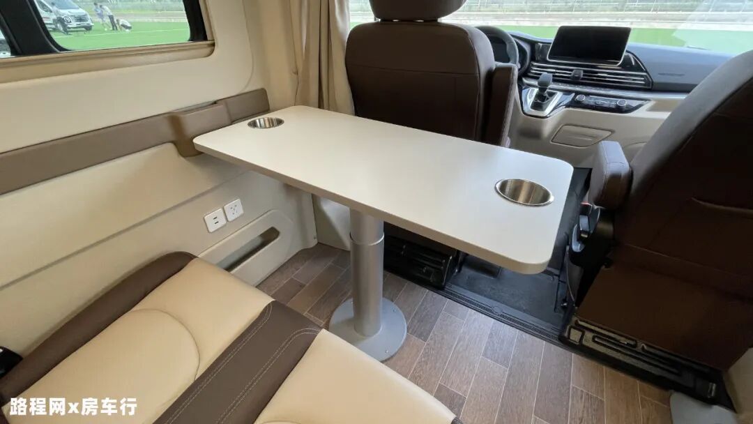座椅前方设有电动升降餐桌,可供日常用餐、休闲娱乐使用;餐桌上带有两个杯托,有效防止行车时杯具跌落;侧方设有电源插座,方便车上人员日常给手机、平板电脑等电子产品充电。
