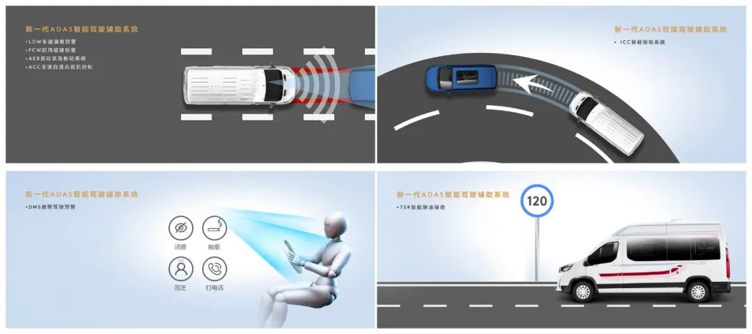 全新一代ADAS2.0智能驾驶辅助系统包含LDW车道偏离预警、FCW前向碰撞预警、AEB自动紧急制动系统、ACC全速自适应巡航控制、ICC超级巡航、TSR智能限速辅助、DMS疲劳驾驶预警等多项智能配置,全方位保障行车安全;