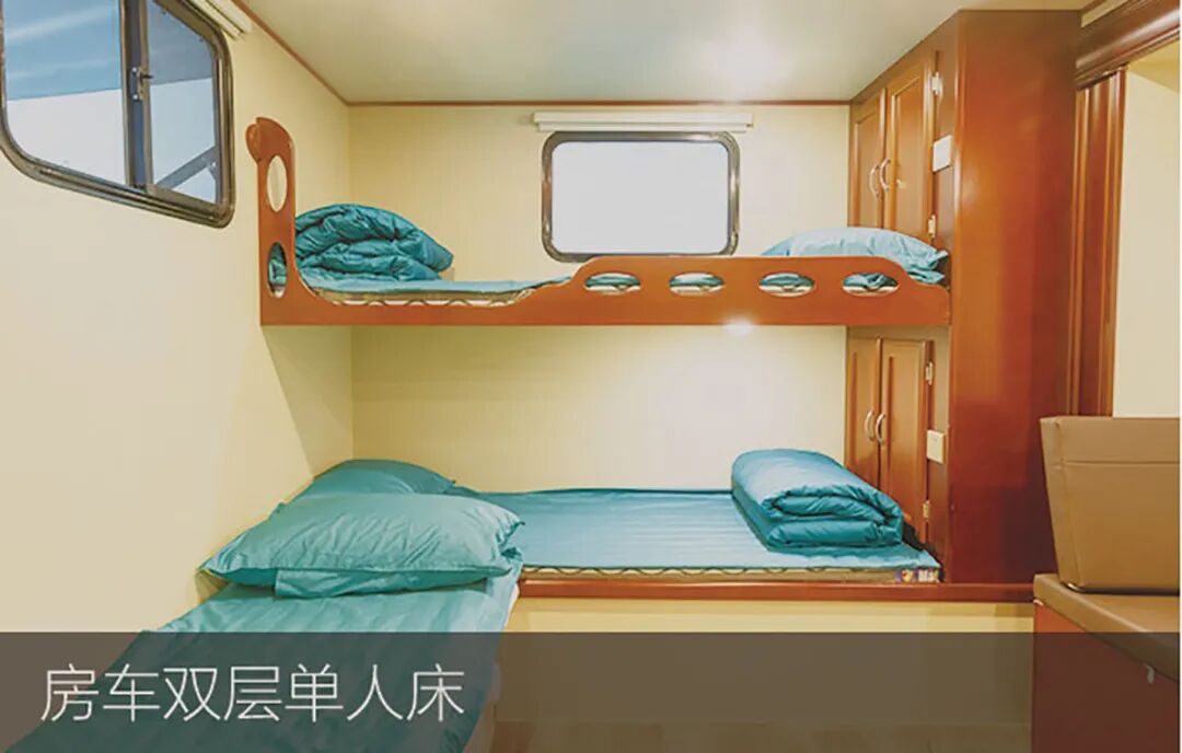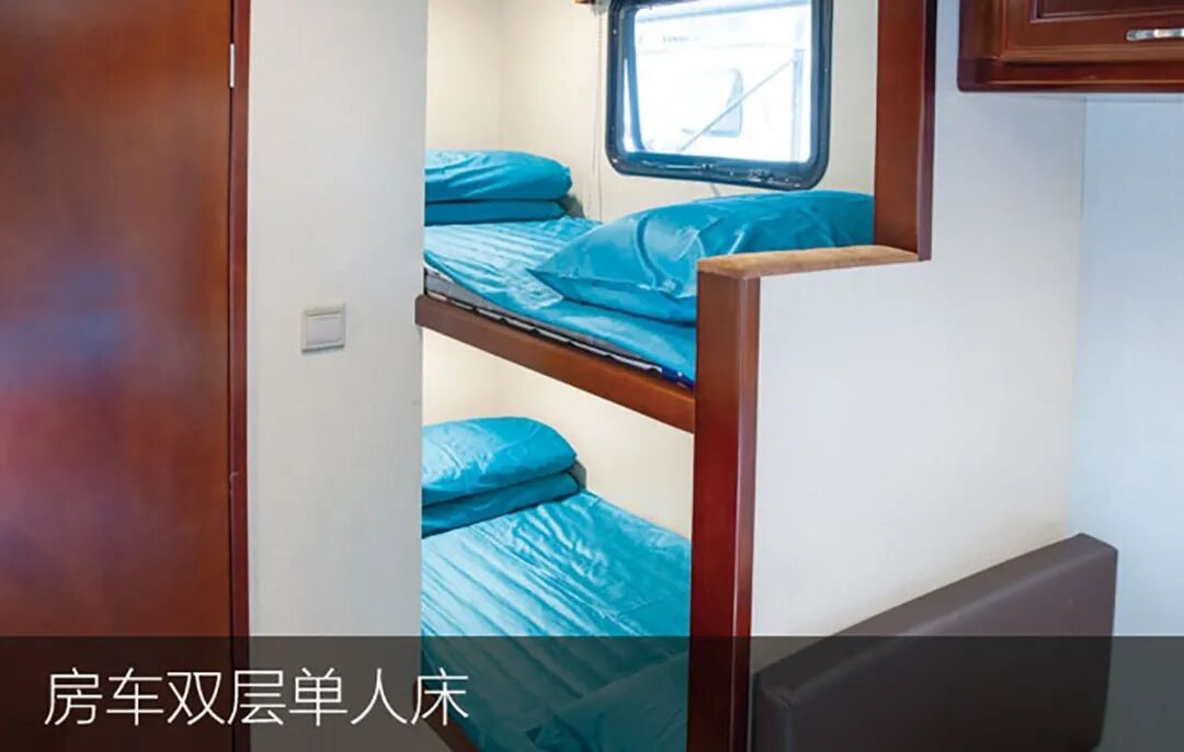 车内尾部便是为休息区域,配置了一张纵置单人床和横置上下铺,床尺寸分别为