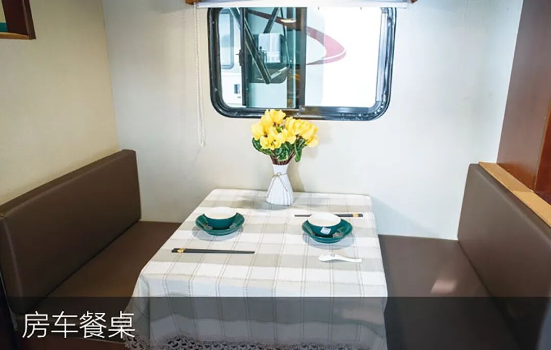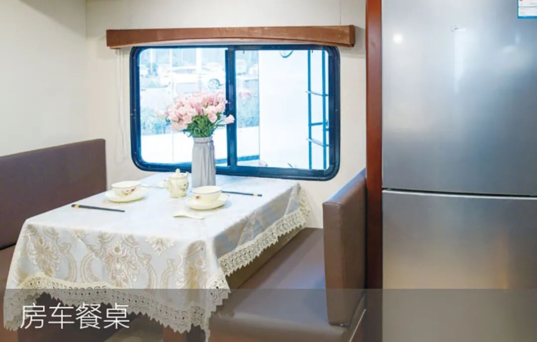 会客区位于卫浴间旁边,采用对坐卡座+可升降餐桌的设计,驻车休息时可以拼床,尺寸为1800×850(mm)的临时床。会客区旁边还安置了一台大容量冰箱,贮存更多新鲜食物。