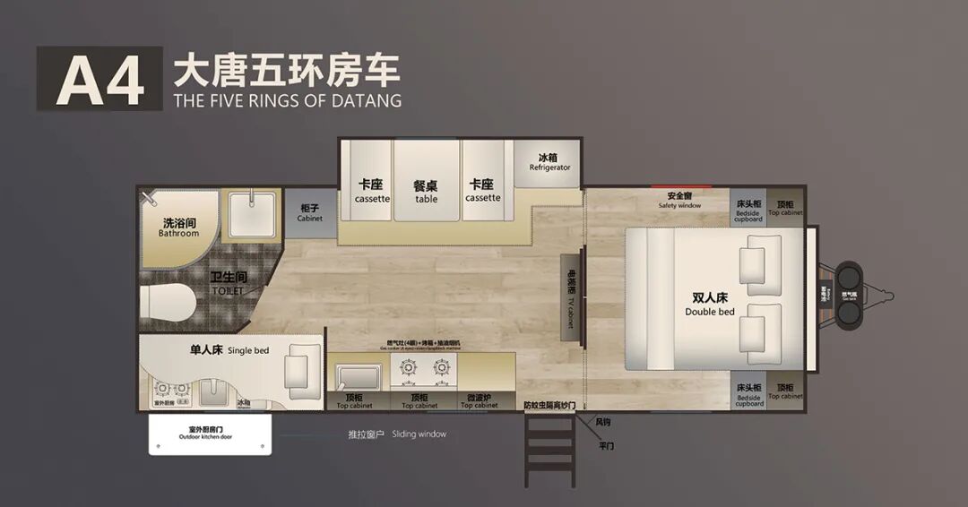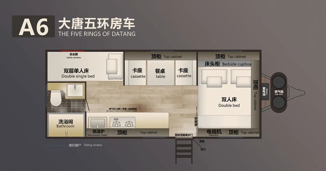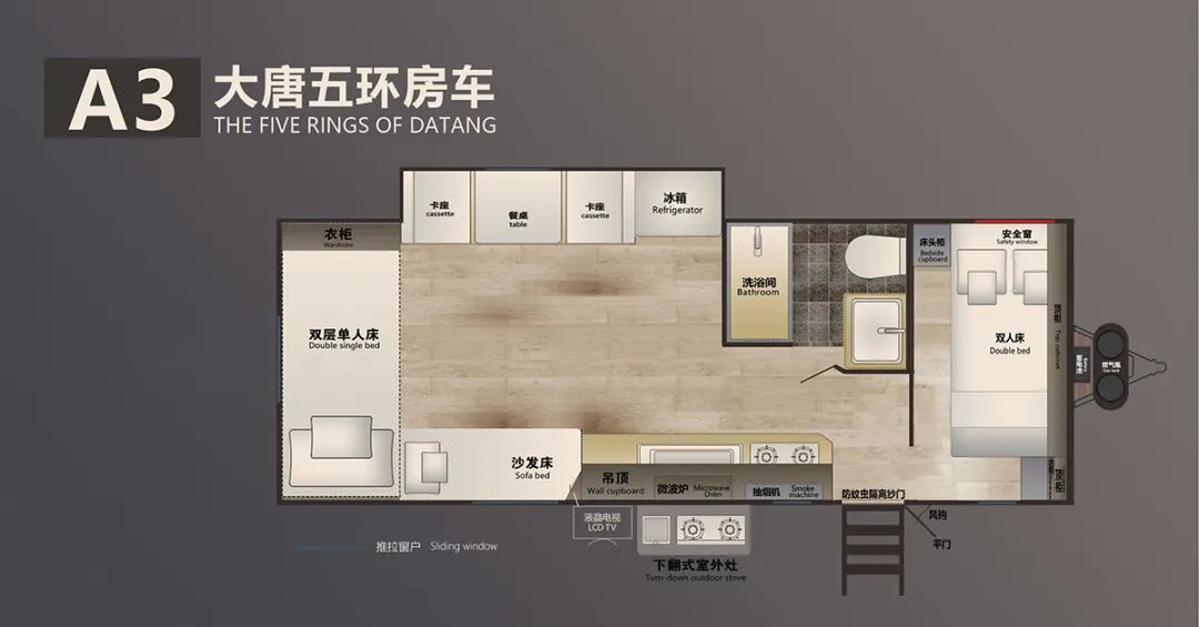 车身内部功能分区独立,从前往后依次是独立卧室、会客区和厨房区、卫浴间和尾部休息区。和A3同样采用了全实木家具及木地板+防水防化耐磨地板革的家居设计;整室内面积达到12.4㎡,可容住6人左右。