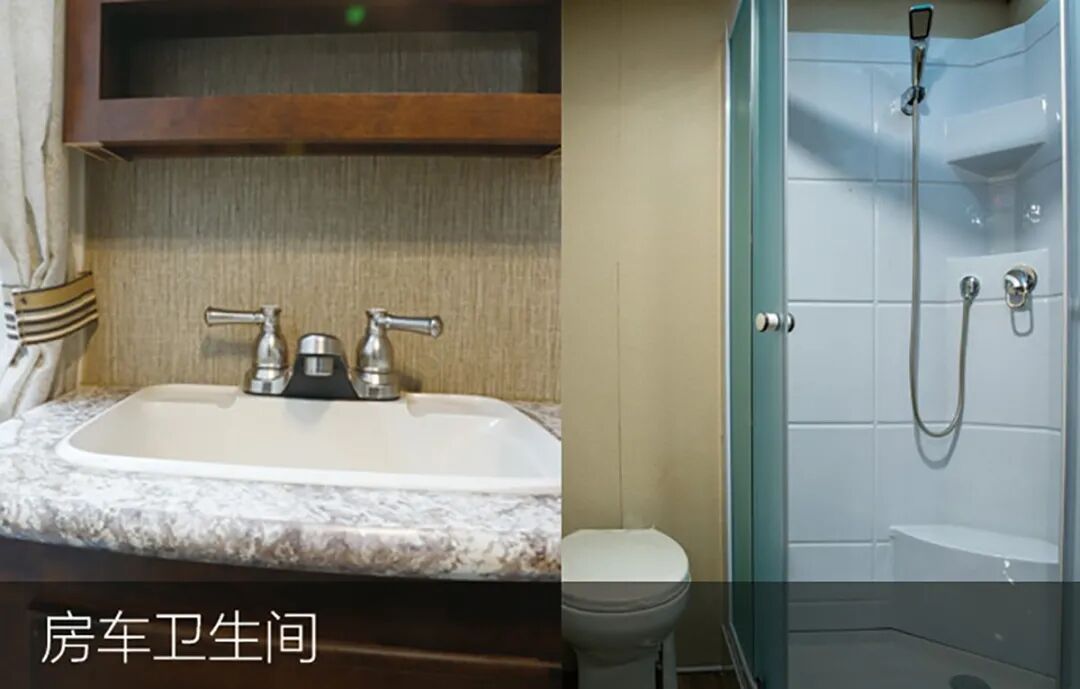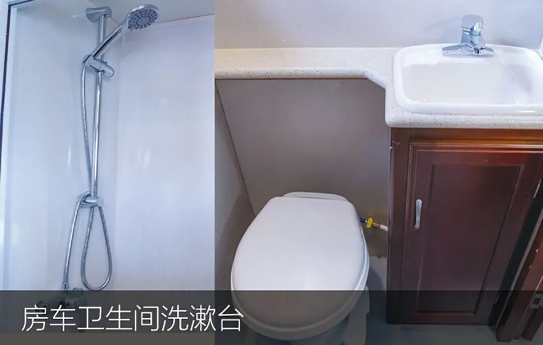 厨房旁边是整车的独立卫浴间,采用干湿分离式设计。配置有洗漱台盆、淋浴花洒和直排式马桶等,可轻松满足日常洗漱需求。