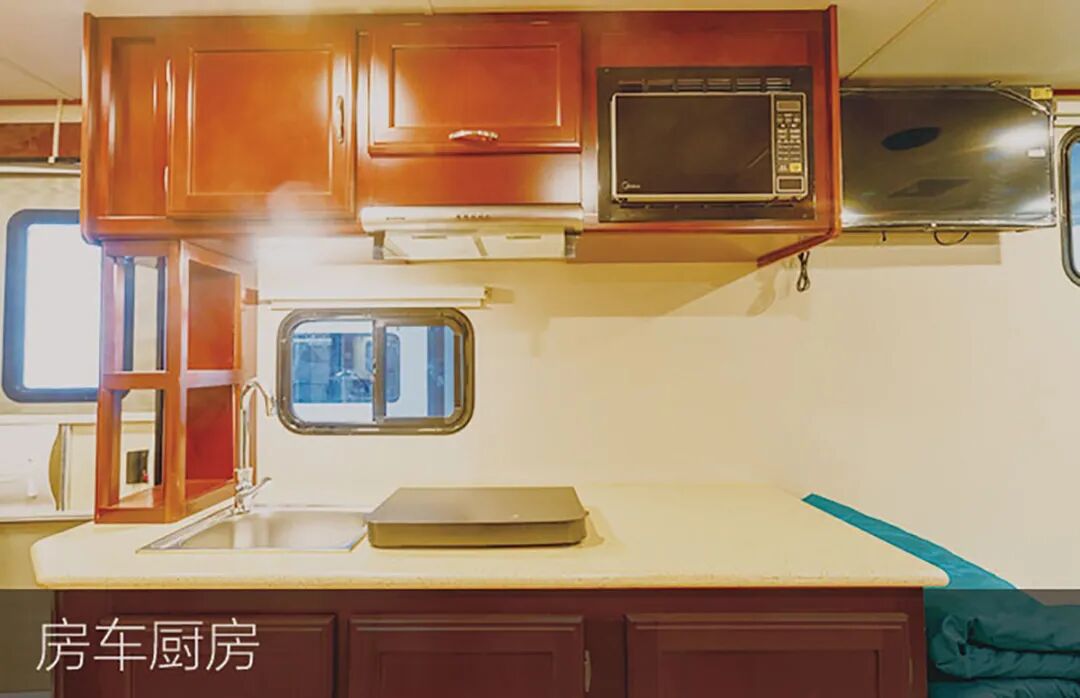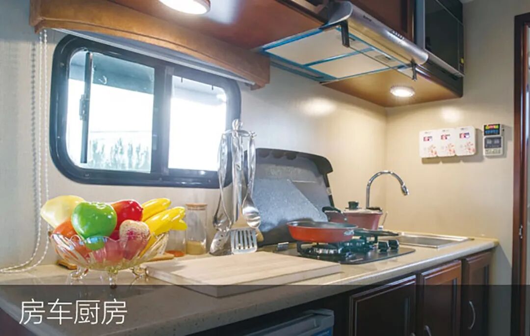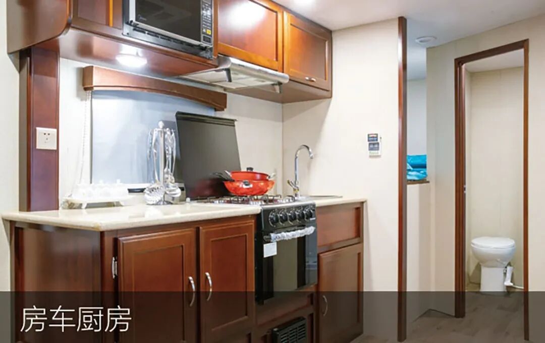厨房区操作空间十分宽敞,配置有仿大理石厨台、便携式电磁炉、抽油烟机、微波炉、不锈钢水槽、吊柜和储物柜等。吊柜旁边还有一台电视,可配合车内音响使用。