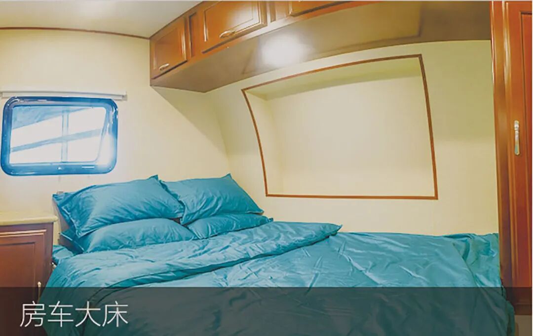 进入内部,车头是一间独立卧室,配置了一张长宽为2000*1500mm的双人大床,适合夫妻二人睡卧。床头设计有侧推窗和一个床头柜,床上则设计了一排储物吊柜。
